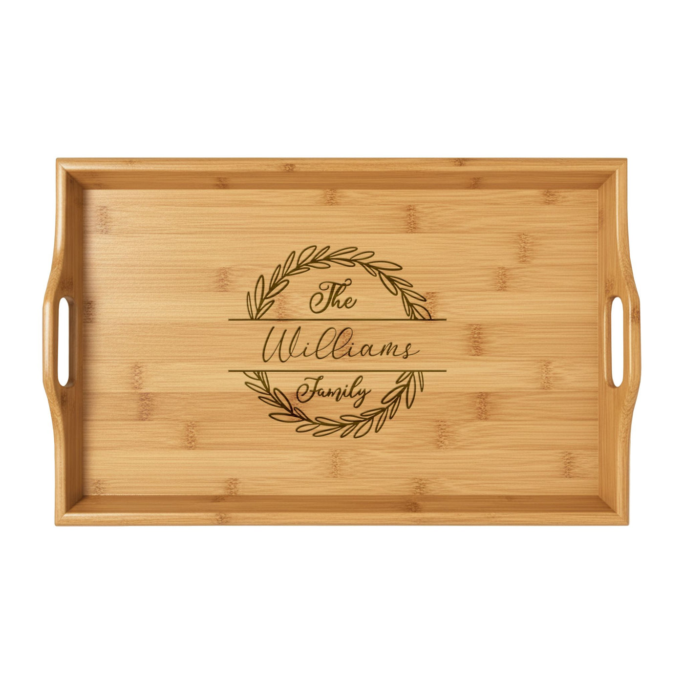 Custom monogram bamboo serving tray, perfect for adding a personalized touch to your kitchen or dining area. This tray exudes a rustic and elegant vibe, making it a great addition to any home decor. Ideal for those who love hosting gatherings and enjoy entertaining guests. Perfect for housewarmings, weddings, and holidays.
